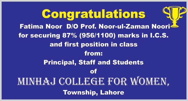 منہاج کالج برائے خواتین میں ثانوی تعلیمی بورڈ کے نتائج کا اعلان، فاطمہ نور کی پہلی پوزیشن