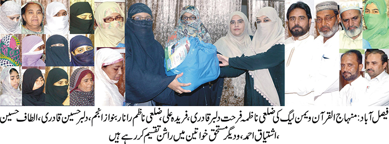 منہاج القرآن ویمن لیگ فیصل آباد کے زیراہتمام مستحق خاندانوں میں راشن تقسیم کرنے کی تقریب منعقد ہوئی، جس میں 50 سے زائد مستحق خاندانوں میں راشن کے پیکٹ تقسیم کیے گئے۔ تقریب میں فرہدہ علی، طاہرہ شکور، شمائلہ انجم، حرا دلبر، اقرء اکرم، غلام محمدقادری، دلبر اعوان، جعفر حسین گجر، اشتیاق حسین، الطاف حسین بھی موجود تھے۔