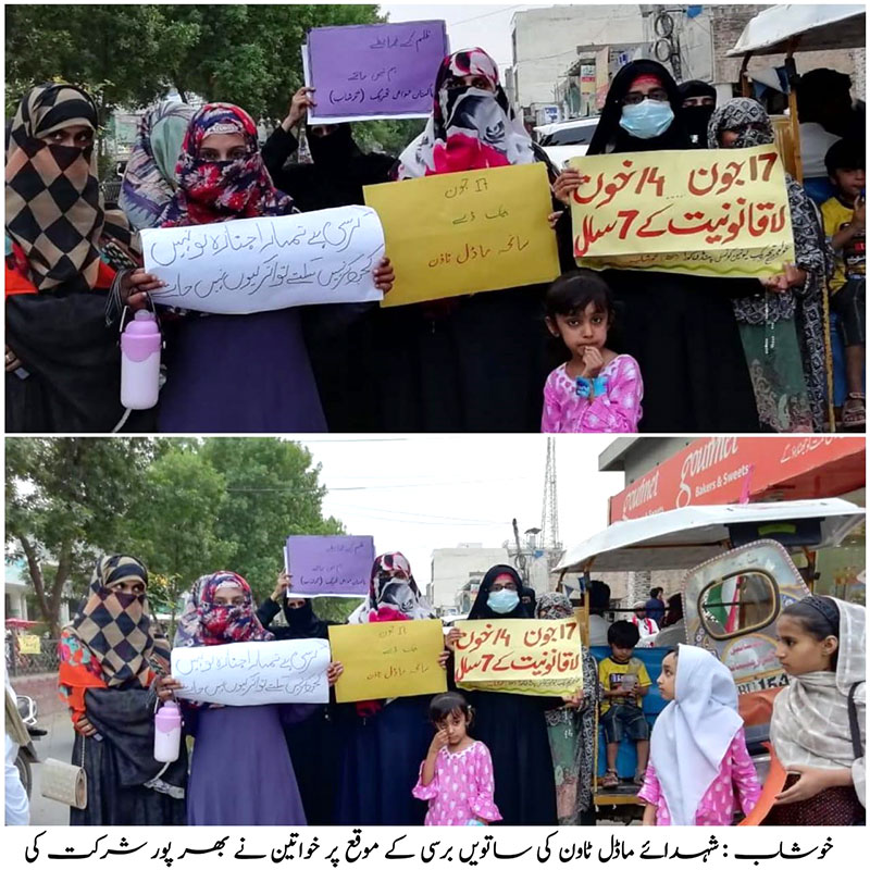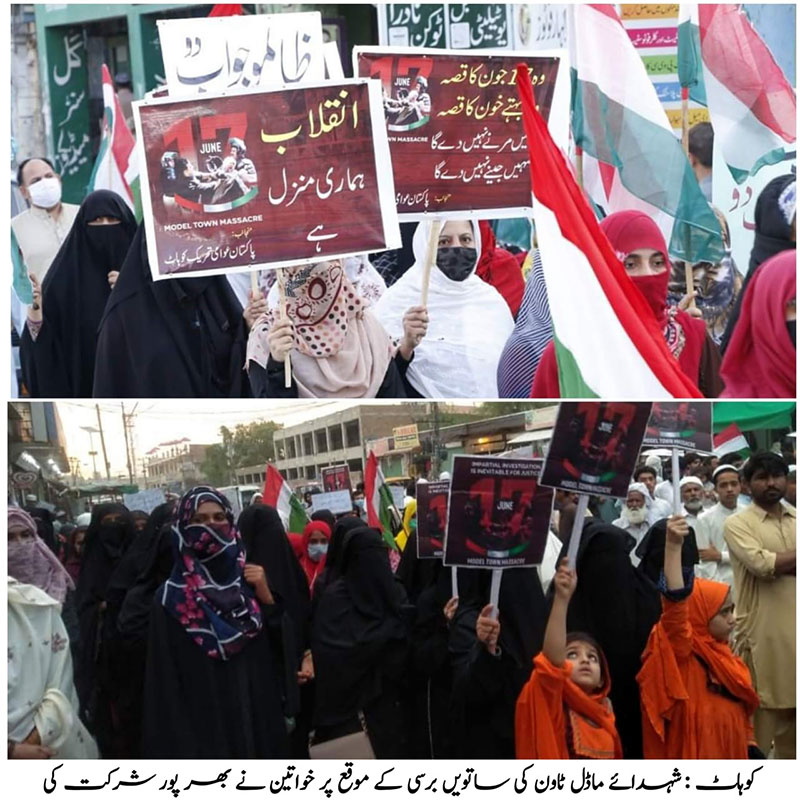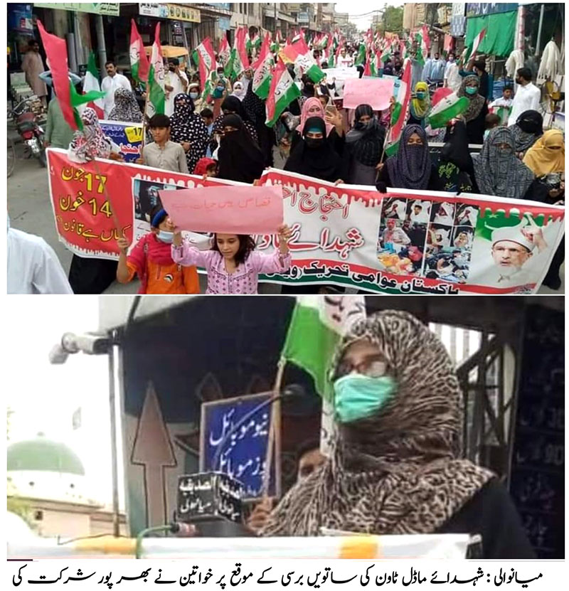 شہدائے ماڈل ٹاؤن کے ورثاء کیساتھ اظہار یکجہتی اور حصول انصاف کے لیے نکالی گئی ریلیوں میں منہاج ویمن لیگ نے بھرپور شرکت کی۔ لاہور، ملتان، سرگودھا، مریدکے، شورکوٹ، چنیوٹ، حافظ آباد، فیصل آباد، خوشاب، نارووال، حیدر آباد، میانوالی، دیپالپور، بھکر، اٹک، دینہ، ایبٹ آباد، پشاور، ٹوبہ ٹیک سنگھ، اسلام آباد، لالیاں، کوہاٹ، کراچی، جہلم، چکوال اور راولپنڈی میں ہونے والے احتجاج اور ریلیوں میں منہاج ویمن لیگ نے شرکت کی اور شہدائے ماڈل ٹاؤن کے لیے انصاف کی فراہمی کا مطالبہ کیا۔